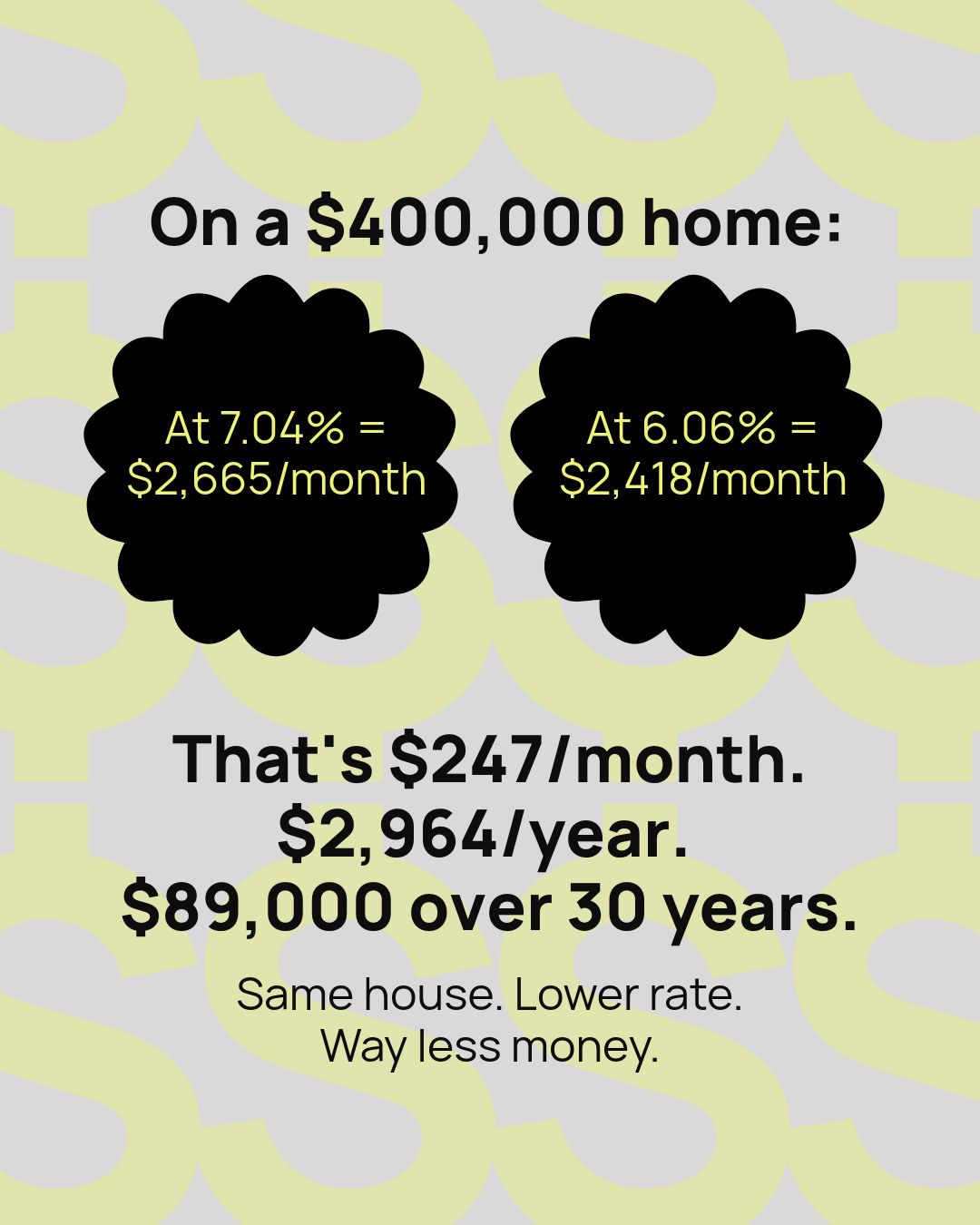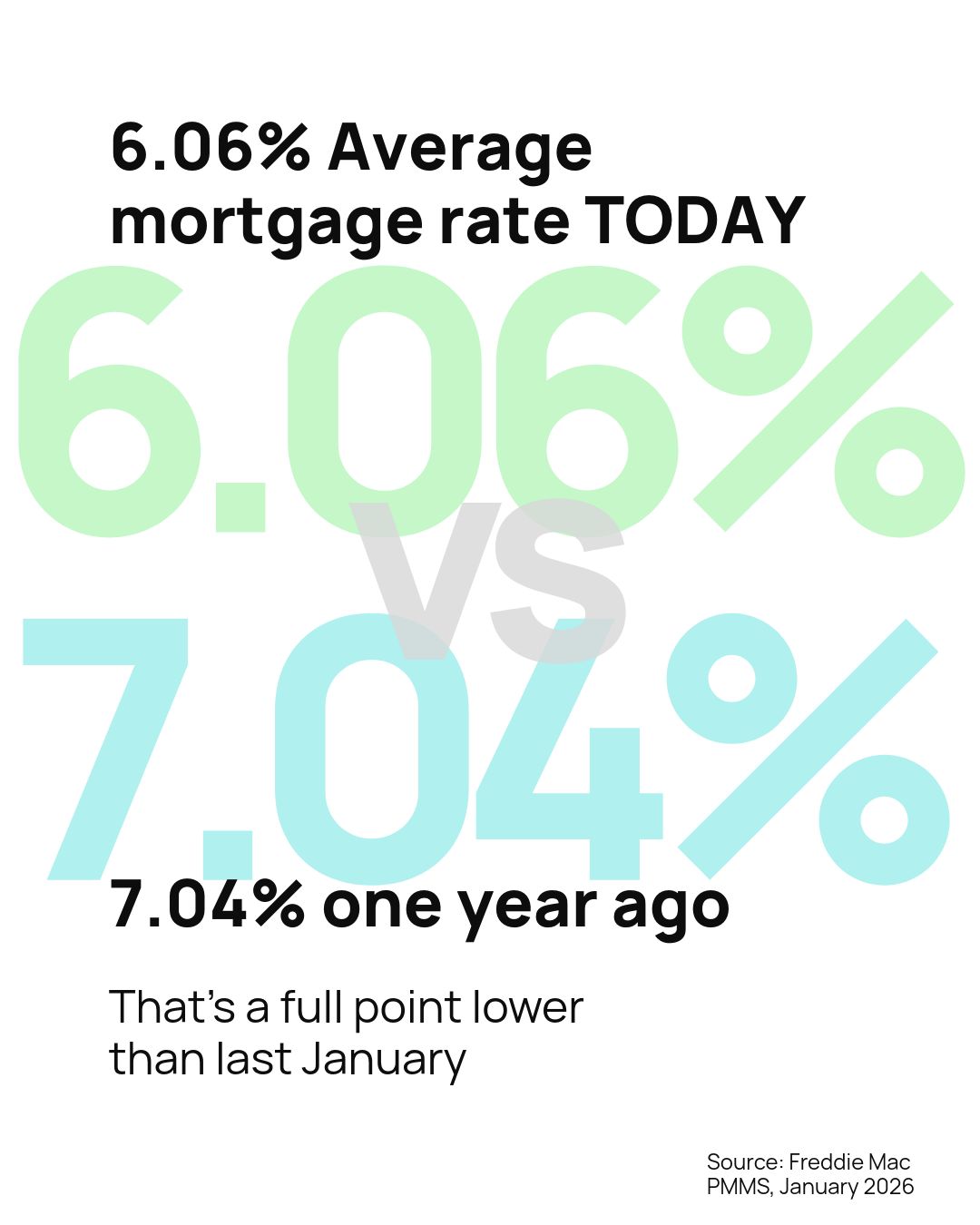 Mortgage rates are averaging 6.06% right now. A year ago they were over 7% according to Freddie Mac. On a $400,000 home, that’s around $247 less per month. Same house. Lower payment.